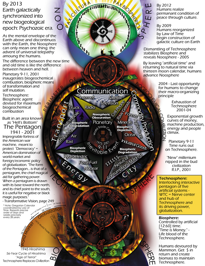 Artificial time, like anything artificial is bound to collapse sooner than later. That means the technosphere is bound to collapse, sooner than later. That collapse began on the 9-11. What will replace the technosphere? The noosphere. The noosphere is Earth’s mental sphere. It was predicted by Teilhard de Chardin and Vladimir Vernadsky (who both coined the term in 1926) to supersede the biosphere.
