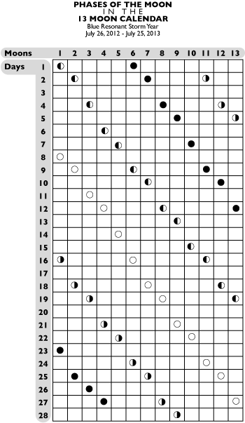 For example here is the graphic of the full and new moon cycles as seen within the 13 Moon/28-day matrix for the upcoming Resonant Storm Year (26, July 2012 – 24, July 2013).