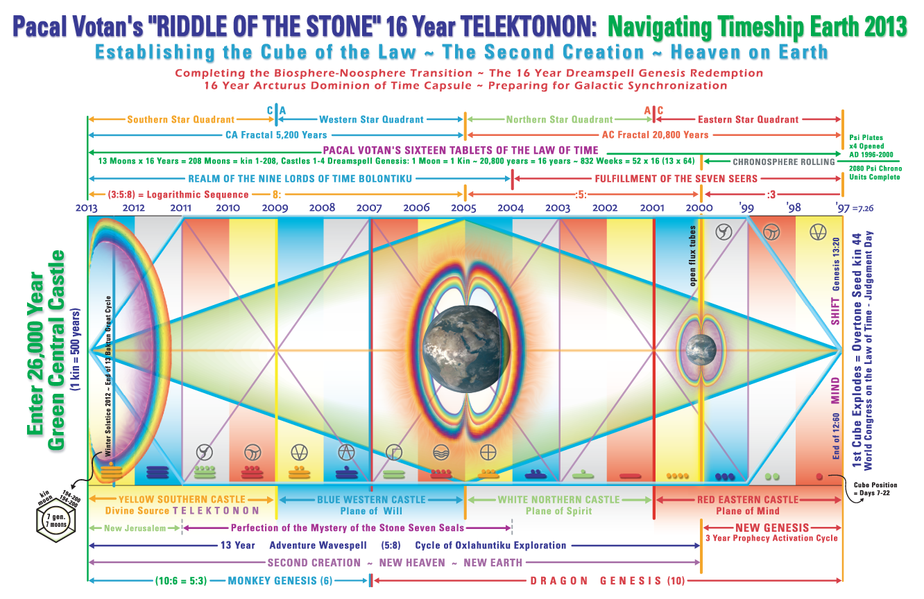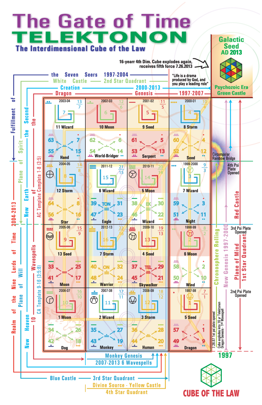What was woven by the Law of Time in the era of the cosmic unconscious is revealed by the Law of Time as the foundation of the era of cosmic consciousness. All that has ever been and will be are in the codes of life governed by the Law of Time. To make this process conscious is the function of the 16-year CUBE OF THE LAW (1997-2013).