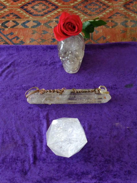 keysThen I went to a Farmer’s Market, and the first thing I noticed was a man (named Ulysses) selling unique jewelry. I was amazed to see two  KEY necklaces wrapped in copper. I told him my dream and got the two necklaces, one for me and one for Crys’tal.  (photo to right 2 keys sitting on Excalibur crystal and red rose sitting on Star Rainbow Serpent. Cosmic Serpent dodecahedron New Time crystal in front)