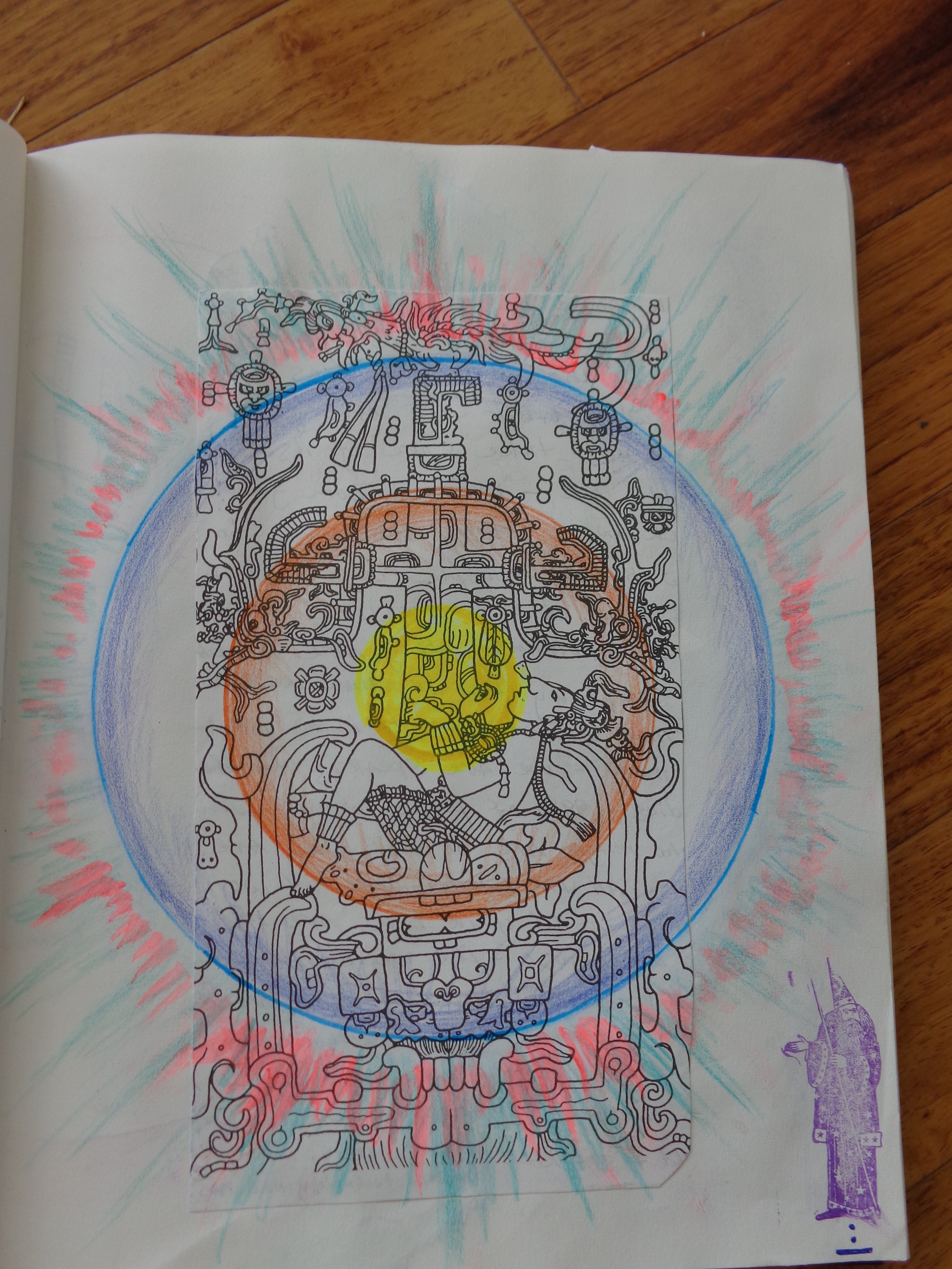 In contemplating this I picked up one of Valum Votan’s journals only to discover two interesting images: One is from the Temple of the Foliated Cross where he had highlighted the cross, and the other the tomb lid of Pacal Votan where the image of the cross cross-shaped structure on the sarcophagus lid is circled.