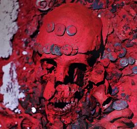 Skull of Red Queen with red cinnabar. In Palenque Temple 12 is the Temple of Skulls and Temple 13 houses the tomb of the Red Queen.