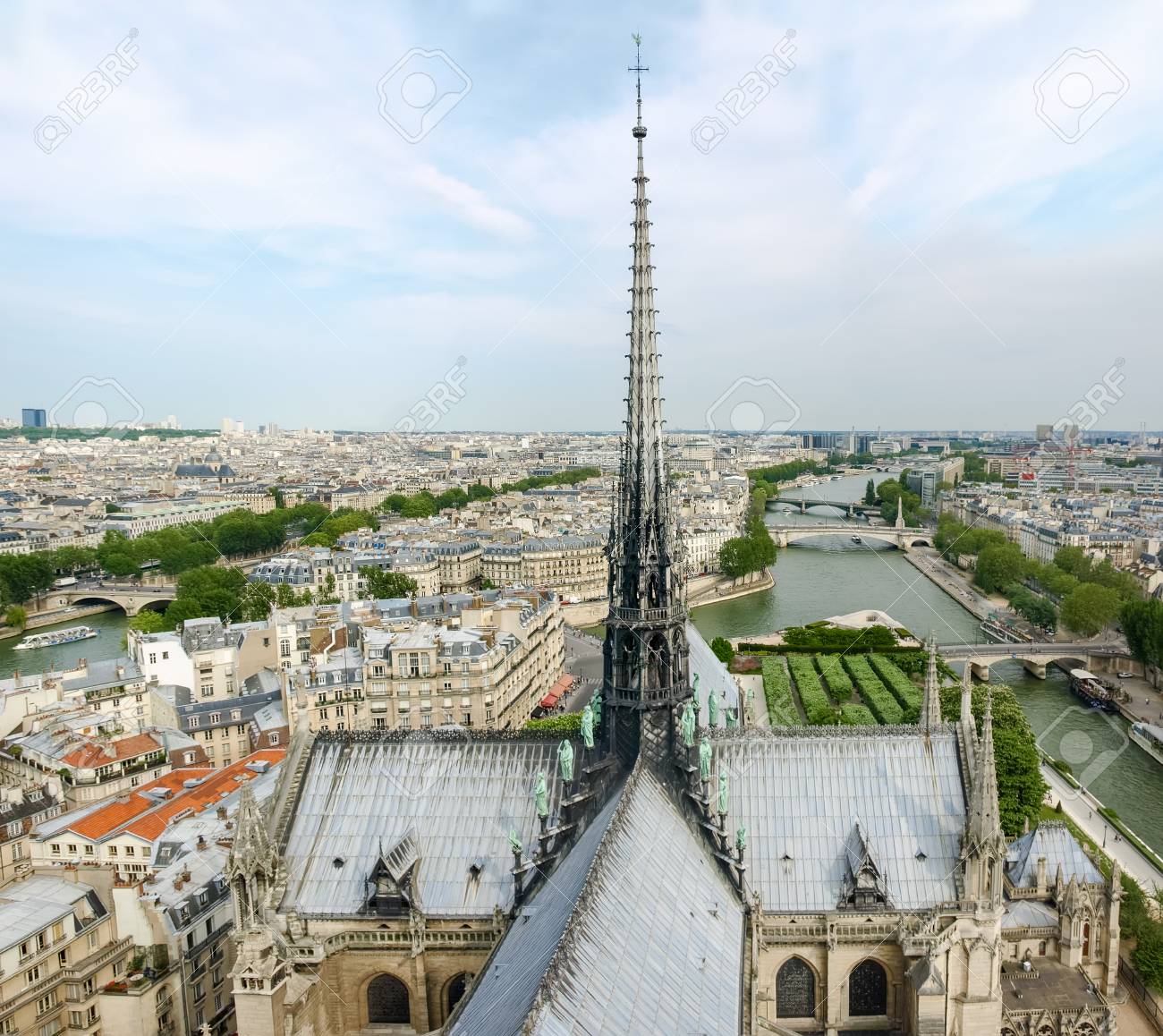 View of southeastern part of Paris from Cathedral Notre-Dame Published 16 April, 2019 at 1300 × 1158 in Notre Dame: Synchronicity and Symbolism Top view of southeastern part of Paris from the tower of the Cathedral Notre-Dame de Paris with the roof and the spire of the cathedral on the foreground in the springtime