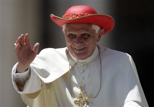 Pope Benedict XVI greets the faithful wearing his Saturn Hat, named after the ringed planet Saturn, during the weekly general audience in St. Peter’s Square at the Vatican, Wednesday May 20, 2009. (AP Photo/Gregorio Borgia) Source: AP – Copyright 2009 The Associated Press. All rights reserved. Associated Press